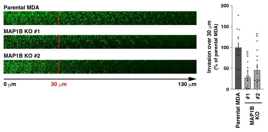 RNAiやゲノム編集によりMAP1Bの発現を抑制したTNBC細胞では、in vitroやマウスモデルにおいて腫瘍の形成や浸潤活性が有意に低下しました(図4)。このとき、MAP1Bの発現を抑制したTNBC細胞では、浸潤突起の形成、成熟も合わせて低下していました(図5)。