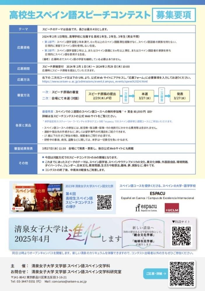 清泉女子大学では2020年から高校生スペイン語スピーチコンテストを実施。開催を重ねることでスペイン語を第二外国語として学ぶ高校生からのエントリーも増え、日頃の学習の成果を発揮できる場として浸透してきている。過去に行われたスピーチでは、スペイン語学習、スペインやラテンアメリカの文化、異文化体験、外国語会話、環境問題、ダイバーシティ、ジェンダー、日本文化、教育問題、生き方や発想法、趣味、夢、家族など、多彩なテーマが取り上げられてきた。