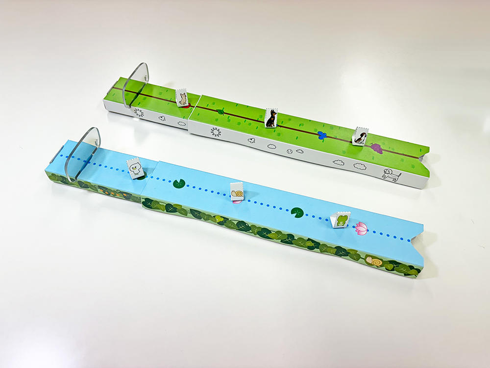 輻湊訓練は間欠性外斜視(*1)の視能訓練として主に用いられ、外斜視の予防や小児期における両眼視機能獲得のサポートになる可能性がありますが、小児の治療においては、成人と比較し輻湊運動の継続性に課題がありました。今回、小児の治療における課題解決を目的として、視覚リハビリを小児が楽しみながら、継続して行えるよう小児用のデザイン「ドッグランをモチーフとしたデザイン」と「オリジナルキャラクター(あひるの子と仲間たち)デザイン」の2種類の器具をペーパークラフトスタイルで作成しました。輻湊運動のトレーニングは中間視からのストレッチが理想(*2)とされており、輻湊運動トレーニング器具の先端にCAミラー(コミー株式会社)を装着することで、輻湊運動のストレッチ距離が2倍になり、中間距離から輻湊運動のストレッチが行える仕様となっています。