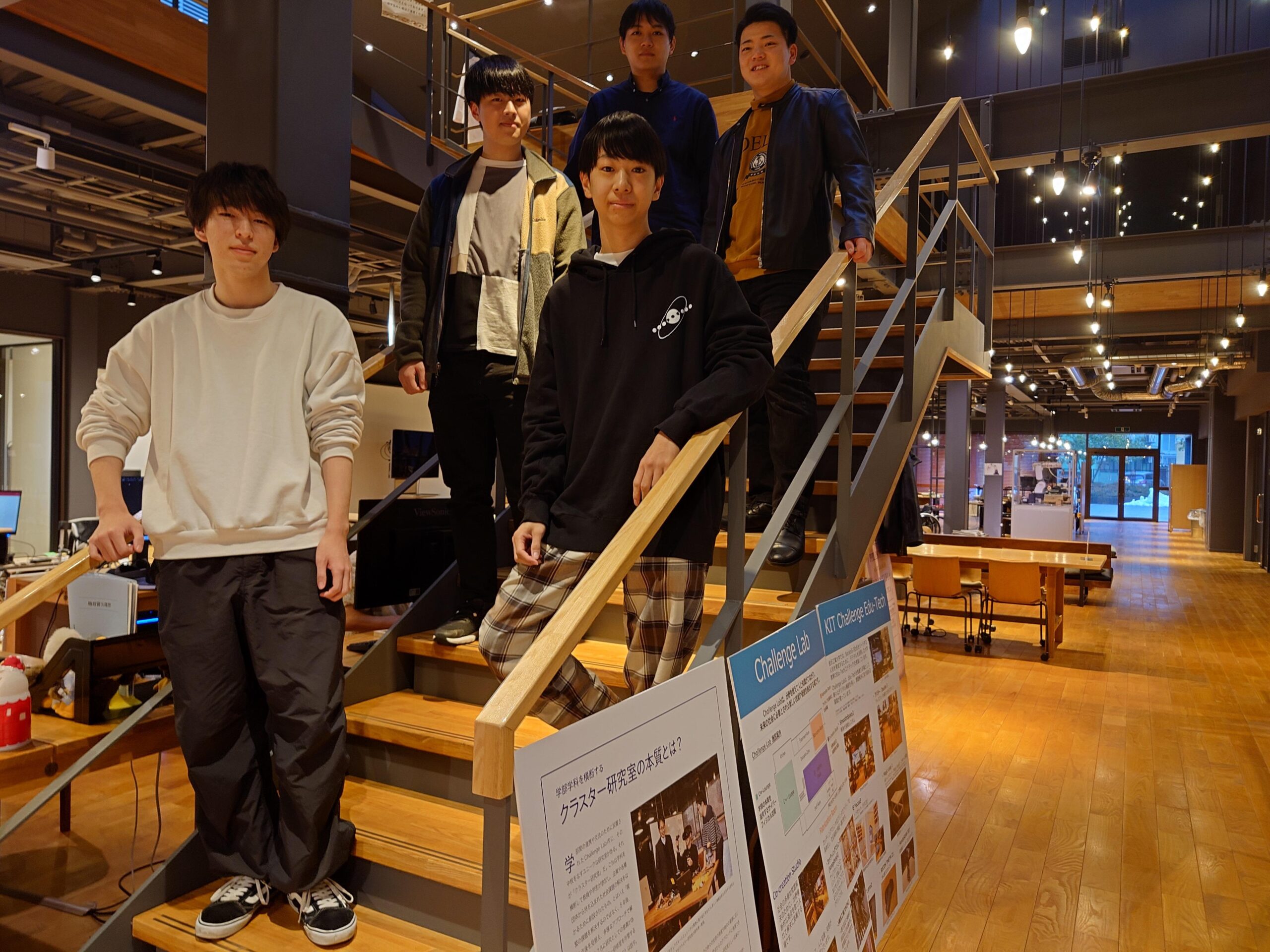 写真左から増田 圭亮さん(大学院修士課程1年)、山内 直哉さん(情報工学科 1年)寺澤 望さん(情報工学科2年 チームリーダー)、河合 真志さん(情報工学科2年)、高輪 一貴 さん(情報工学科3年)(プロジェクトの活動拠点 金沢工業大Challenge Labで)