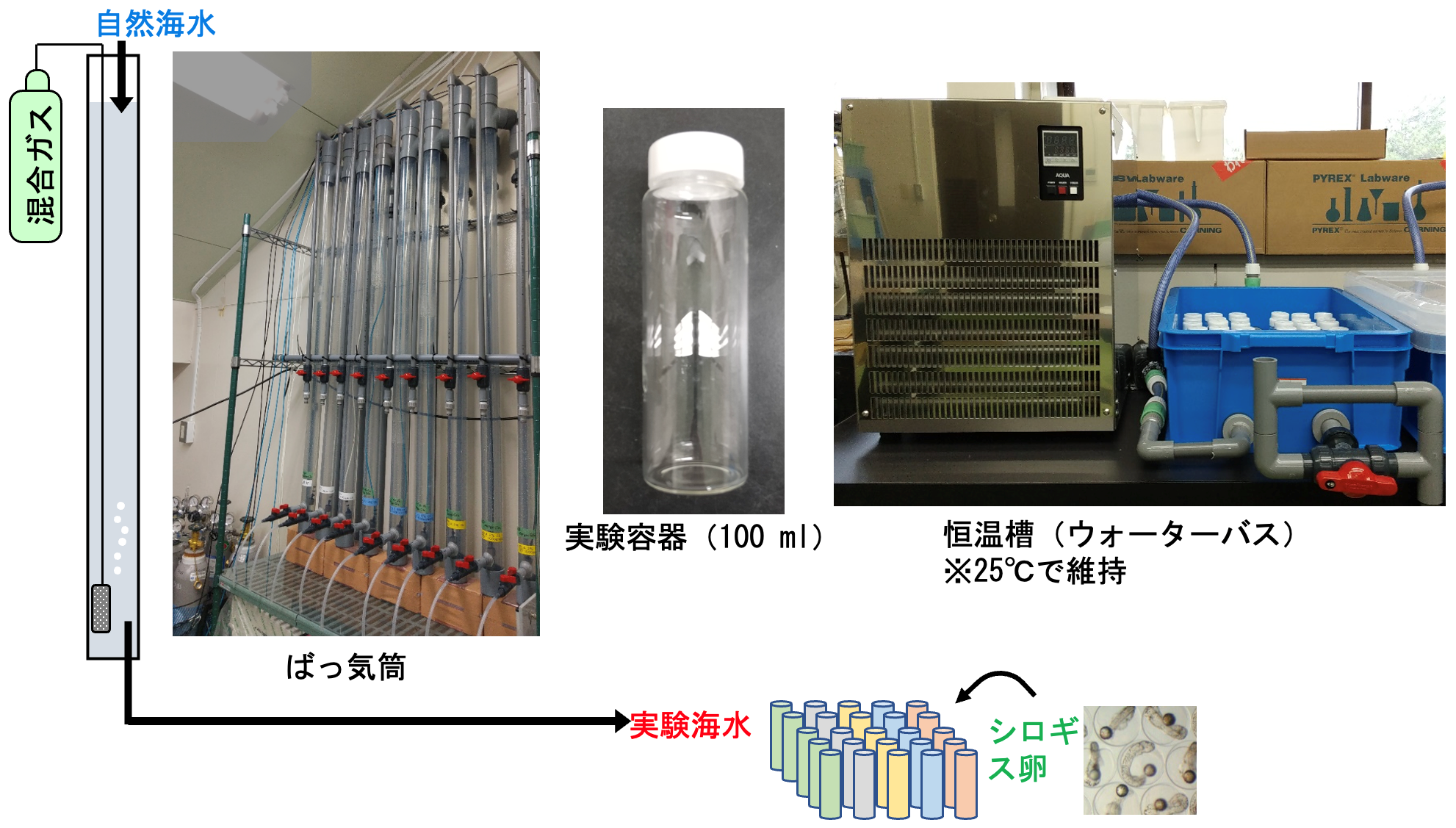 人為的な二酸化炭素排出の増加に伴う環境変化が、海洋生態系に及ぼす影響が懸念されています。地球温暖化・海洋酸性化に関しては、野外調査や飼育実験などの手法を通じて、海洋生物に与える影響は知見の蓄積が進んでいます。一方、近年では海洋の貧酸素化による影響も懸念され、温暖化・酸性化と合わせてDeadly Trio(死のトリオ)とも呼ばれていますが、これらが複合して海洋生態系に与える影響は未知な部分が多いのが現状です。これまで単一の影響に注目した評価は進んできましたが、複合影響評価、特に貧酸素海水にも着目した研究はほとんど行われてきませんでした。