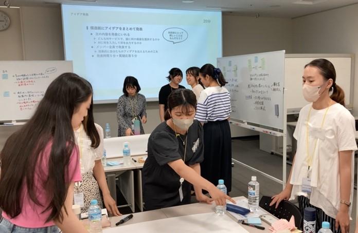 本プログラムでは、東京コースと大阪コースを設けており、学生は希望するコースを選択し、それぞれで設定されたテーマについて、2大学合同のグループで課題解決に取り組みます。東京コースに参加する近畿大学生、大阪コースに参加する東京女子大学生の交通費(東京−大阪間)・宿泊費は無料のため、学生は居住地に縛られずに好きなコースを選ぶことができます。各コースのプログラム最終日には、グループで話し合った具体的な成果について、株式会社電通総研と株式会社ニトリホールディングスの社員に向けてプレゼンテーションを行います。