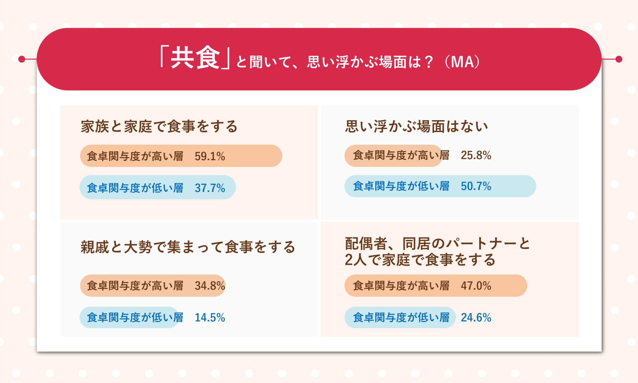 上記の調査結果を食卓関与度別に比較したところ、食卓関与度が高い層ほど、思い浮かぶ場面の選択数が多く、1位の「家族と家庭で食事をする」を選択したのは、食卓関与度が高い層が59.1%、食卓関与度が低い層で37.7%という結果でした。尚、2位の共食と聞いて「思い浮かぶ場面はない」という回答については、食卓関与度が高い層は25.8%しか選択していない一方、食卓関与度が低い層は、50.7%も選択しており、両者では「共食」へのイメージや理解がかなり異なることがわかりました。