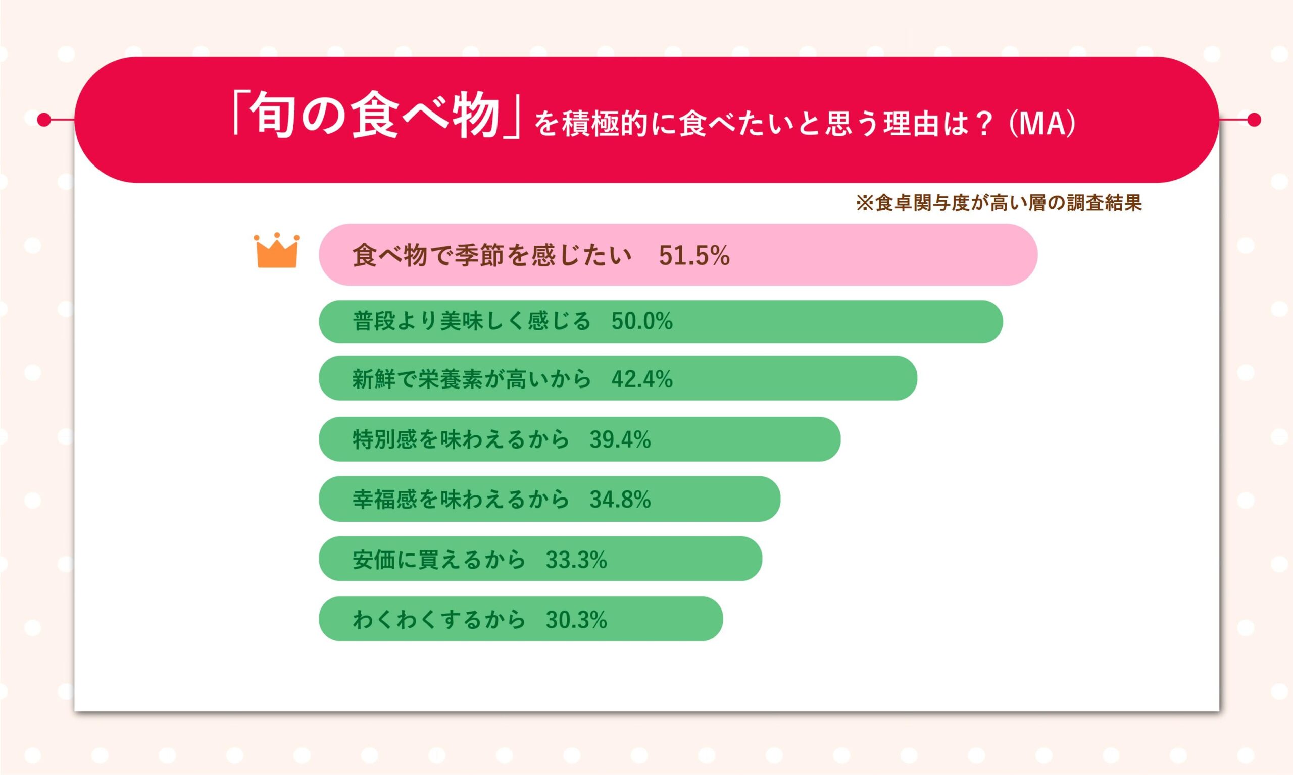「旬の食べ物」を積極的に食べたいと思う理由を調査したところ、食卓関与度が高い層は、「食べ物で季節を感じたい(51.5%)」、「普段より美味しく感じる(50.0%)」、「わくわくする(30.3%)」と、旬の食べ物への感度が高く、食卓関与度が影響していることがわかりました。季節を感じながら、食のおいしさ、楽しさを実現するために、普段の食事に旬の食材を取り入れることは大切であると考えます。