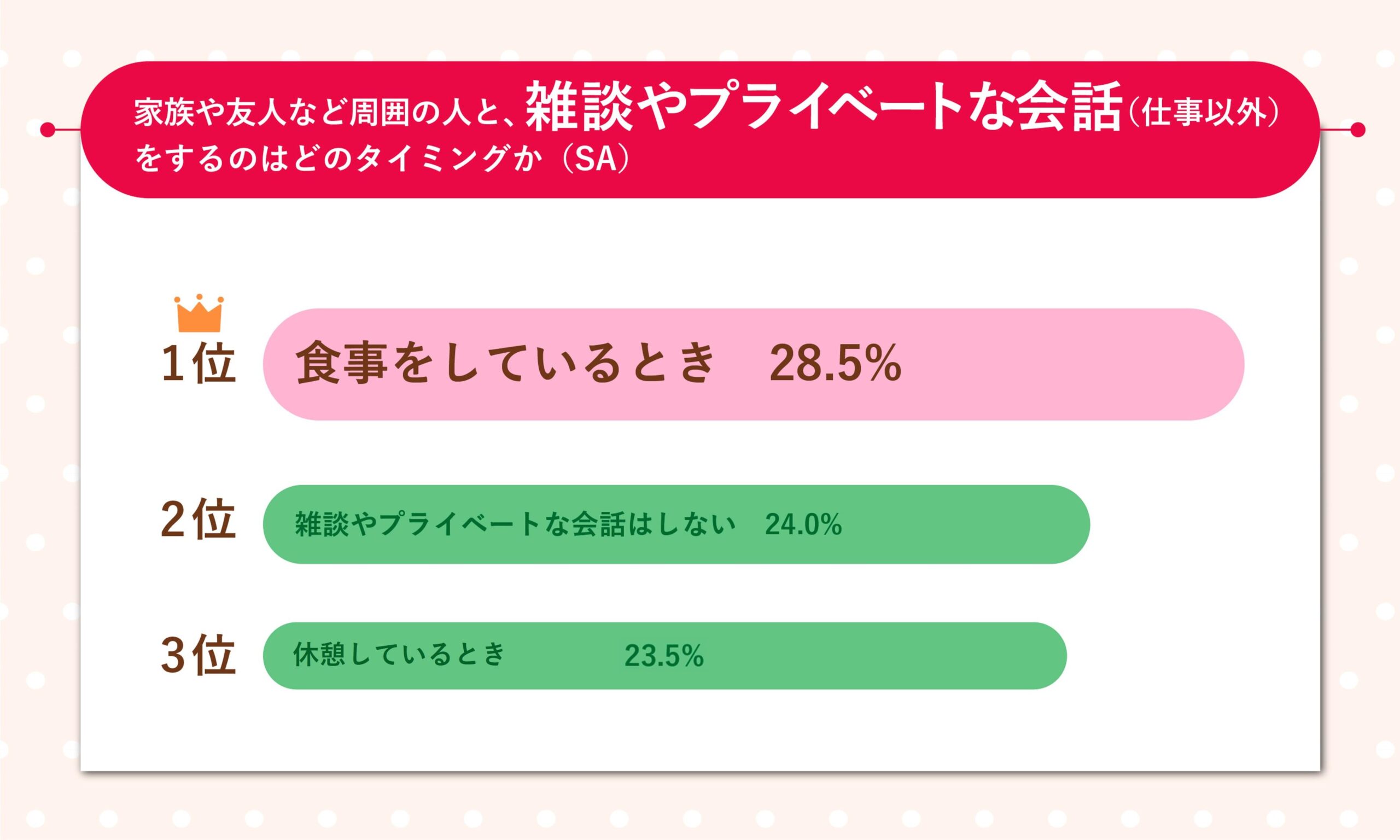 雑談やプライベートな会話をするシーン1位は食事時、2位は会話をしない、3位は休憩時