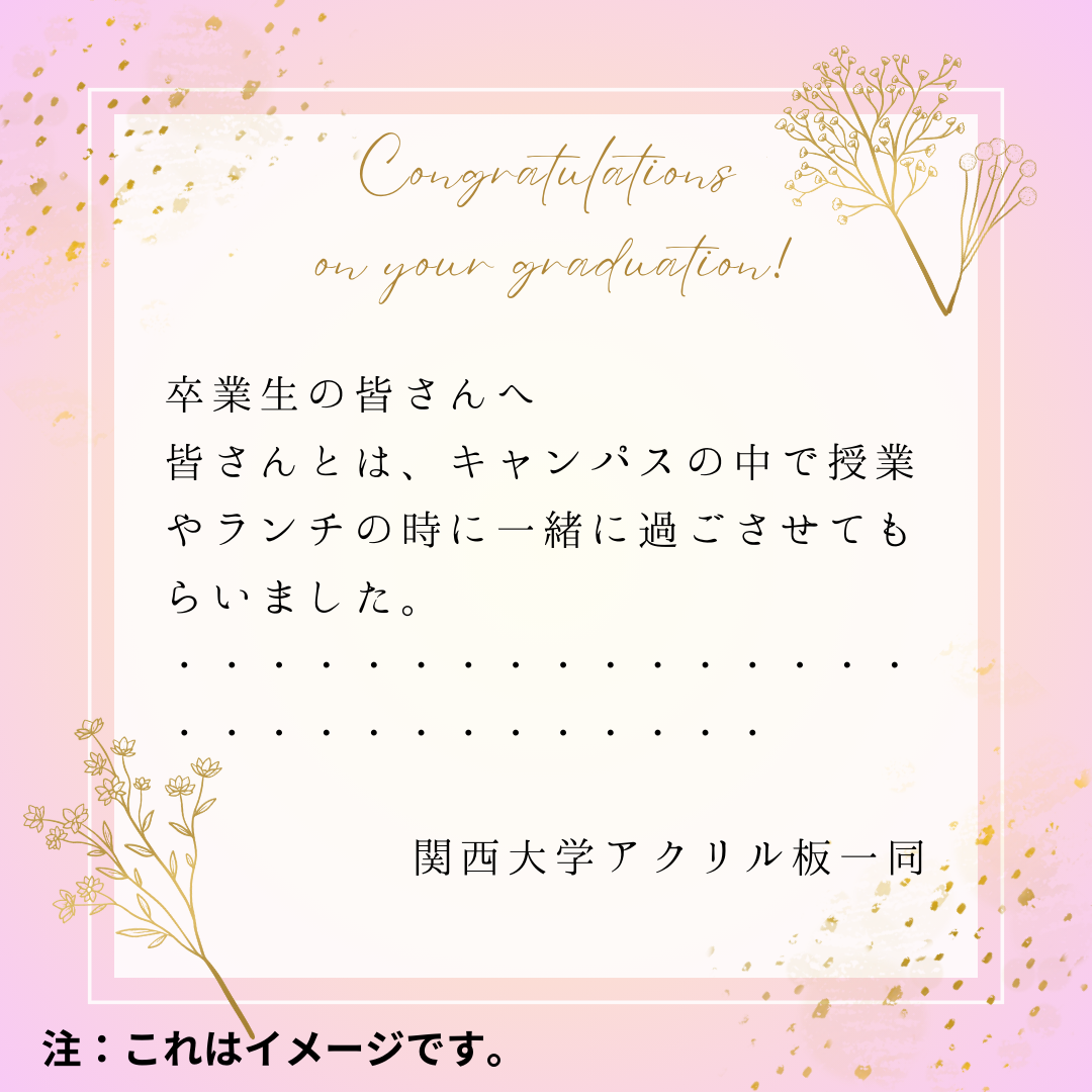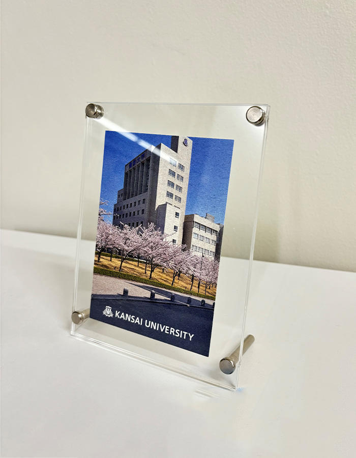 関西大学ならびに関西大学教育後援会では、2024年3月に卒業する大学生・大学院生を対象に、学内で使用していた飛沫防止用アクリル板パーテーションを再利用したフォトスタンドを製作し、卒業記念品としてプレゼントします。