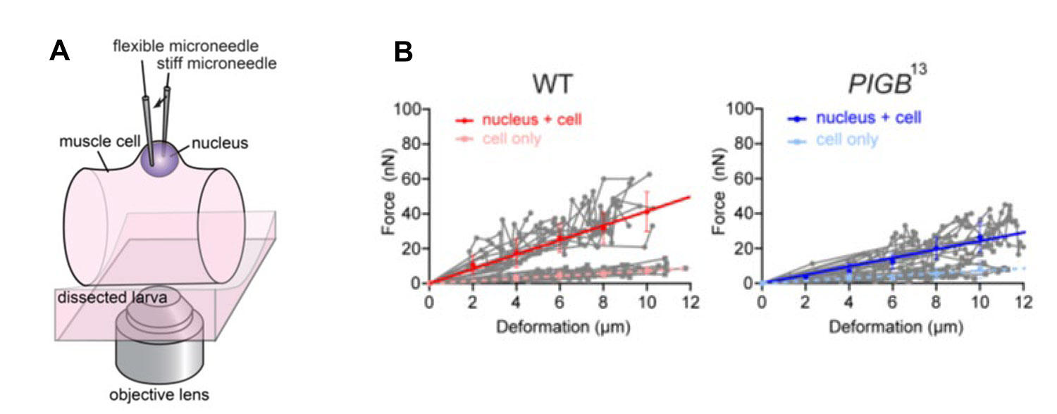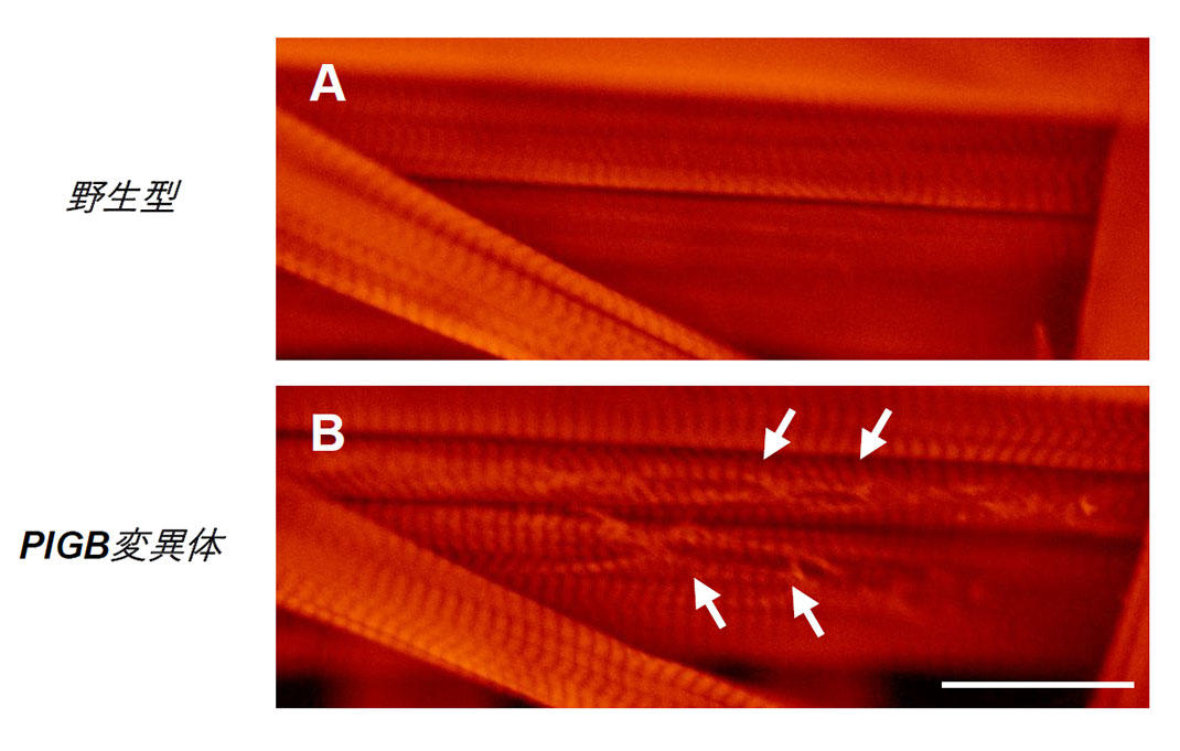本論文において、私達は、核膜に局在するタンパク質PIGBが異常になると、核ラミナの均一性が異常になり、図1Bのようにまだらになることを見出した。さらに、このPIGBのショウジョウバエ変異体を解析したところ、PIGB以外の核膜タンパク質の局在が異常になり、正常な核構造を維持できないことを見出した(図2)。さらに、核構造が異常になったので、その核の強度が維持されているかを物理的に測定したところ、PIGB変異体では核の強度が著しく低下していることを見出した(図3)。また、核膜は染色体の高次構造の形成に重要な役割を果たしていることが知られている。そこで、PIGB変異体で染色体の高次構造を網羅的に調べ、正常個体と比較したところ、PIGB変異体では染色体構造が異常になっていることも見出した。染色体の高次構造は遺伝子発現に影響することから、PIGB変異体で高次構造が異常になったところに含まれる遺伝子、特に筋肉の発生や維持に関与する遺伝子の発現をいくつか調べたところ、その中に多くの遺伝子の発現に異常が見られた。そこで、PIGB変異体で筋肉を調べたところ、筋ジストロフィー様の筋肉異常を認めた(図4)。ヒトの核ラミナの変異による疾患であるラミノパチーでは、筋ジストロフィー様の症状が認められることから、本研究成果は、ラミノパチーの理解にも貢献するものと考えられる。また、このように様々な異常が見られることから、PIGBは核の様々な機能を支える重要なタンパク質であることがわかった。