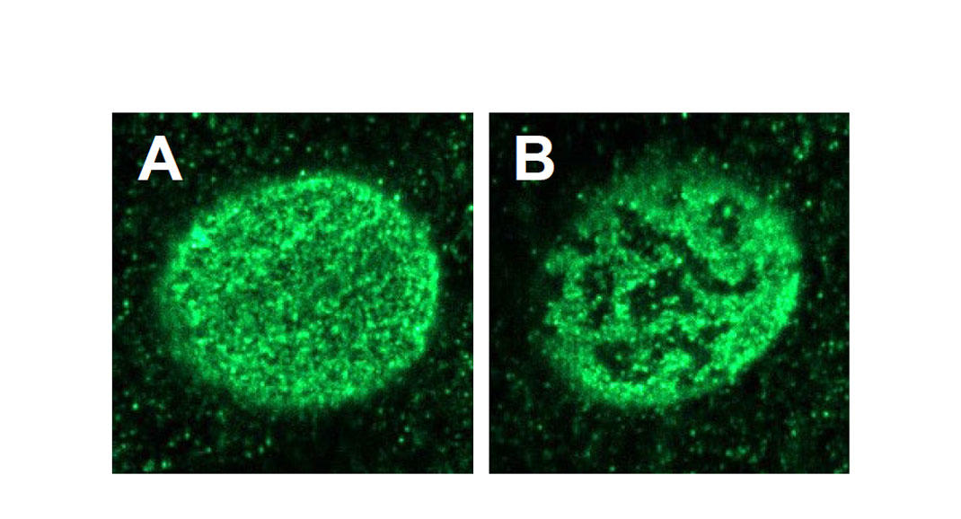 細胞の核は、遺伝情報であるDNAを格納し、その保護と遺伝情報の正確な発現に重要な役割を果たしている。細胞核を詳細に見てみると、まず最も外側には、二重の脂質膜が取り囲み、核膜を形成している。そして、その核膜の内側に核ラミナと呼ばれるメッシュ状の構造体が均一に存在している(図1A)。しかし、この核ラミナの均一性が重要であるかについては、永らく疑問に思われていたが、未解明のままであった。