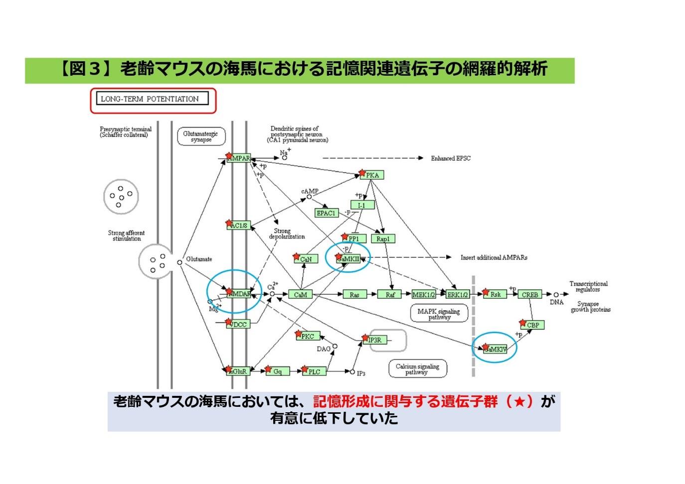 3)老齢マウスと若齢マウスの海馬において発現している遺伝子を網羅的に解析した結果、長期記憶に関連する遺伝子群が老齢では有意に低下していることを明らかにしました。