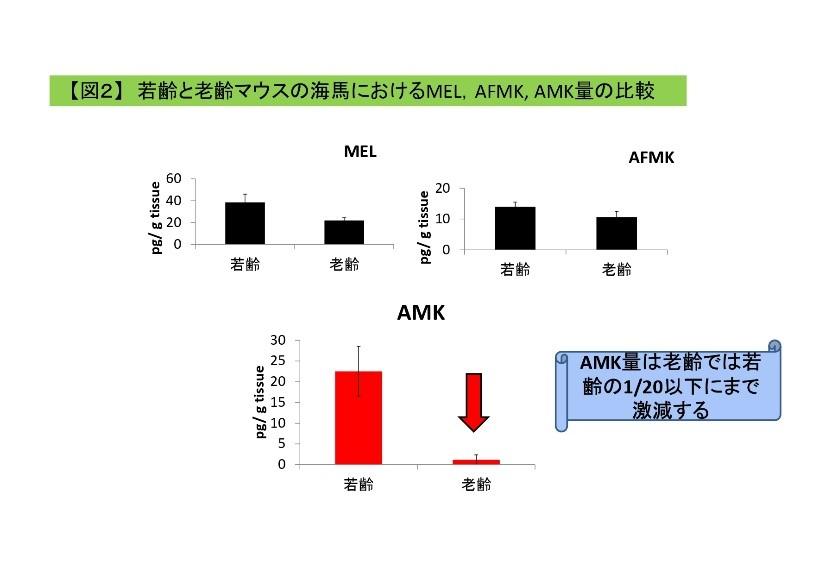 1)老齢になると記憶力が低下するのは、海馬(記憶に重要な脳の部位)におけるN1-acetyl-5-methoxykynuramine(AMK)の低下が原因の一つであることを初めて明らかにしました。