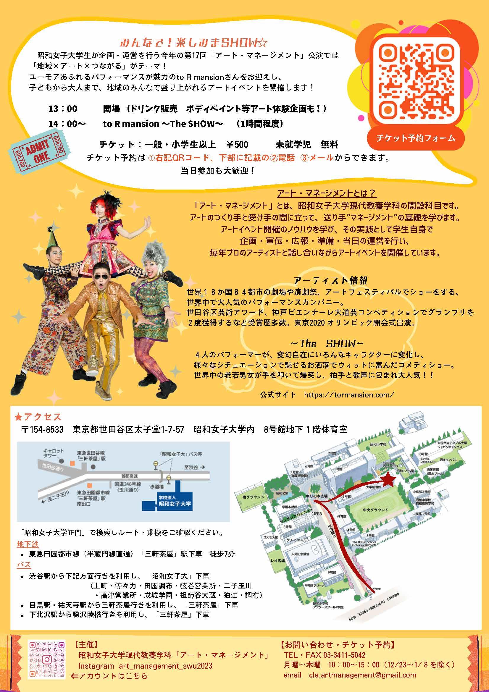 昭和女子大学(学長 金尾朗:東京都世田谷区)で1月20日、現代教養学科「アート・マネージメント」の受講生がアート・イベント「みんなで!楽しみまSHOW☆」を開催、東京オリンピック2020開会式はじめ世界各地の演劇祭などで人気のパフォーマンスカンパニー「to R mansion」が出演します。