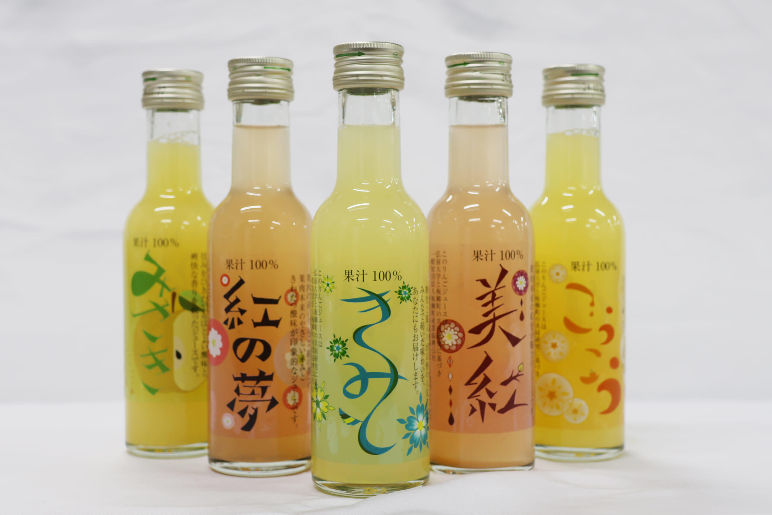 品種ごとに違う果汁の美しい色合いとマッチした魅力的なラベルは、藤崎農場の職員によるデザイン。持ち運びやすく、かつ飲み比べにも適したサイズとして180ml瓶の5本1セットになっている。