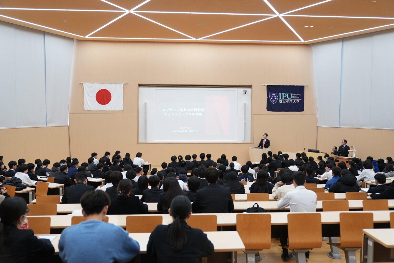 2023年12月4日、環太平洋大学・現代経営学科はネットフリックス合同会社の公共政策担当ディレクター・杉原佳尭(すぎはら よしたか)氏を迎え、「コンテンツ産業の世界戦略:ネットフリックスの事例」というテーマで講演会とディスカッションを開催した。