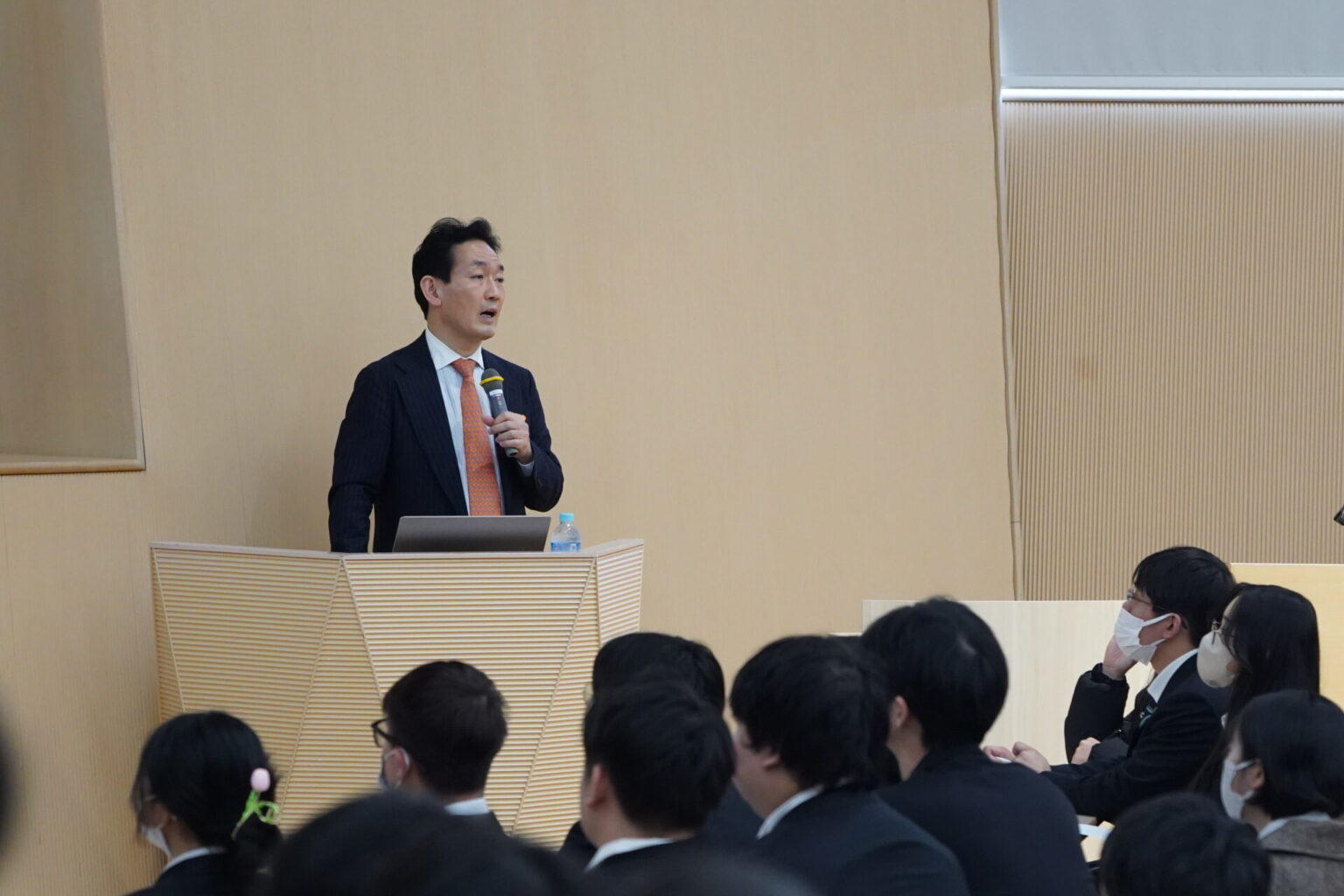 4限の授業(ミクロ経済学)では、聴講生を含め250名以上の学生が出席し、「グローバル社会におけるソフトパワーの役割の重要性」「その中核を担う動画配信ビジネスの拡大と課題」「日本のコンテンツ産業の問題点」「グローバル戦略構築に向けた課題」「日本の文化を世界にどうのように発信していくか」について、熱のこもった講演が行われた。