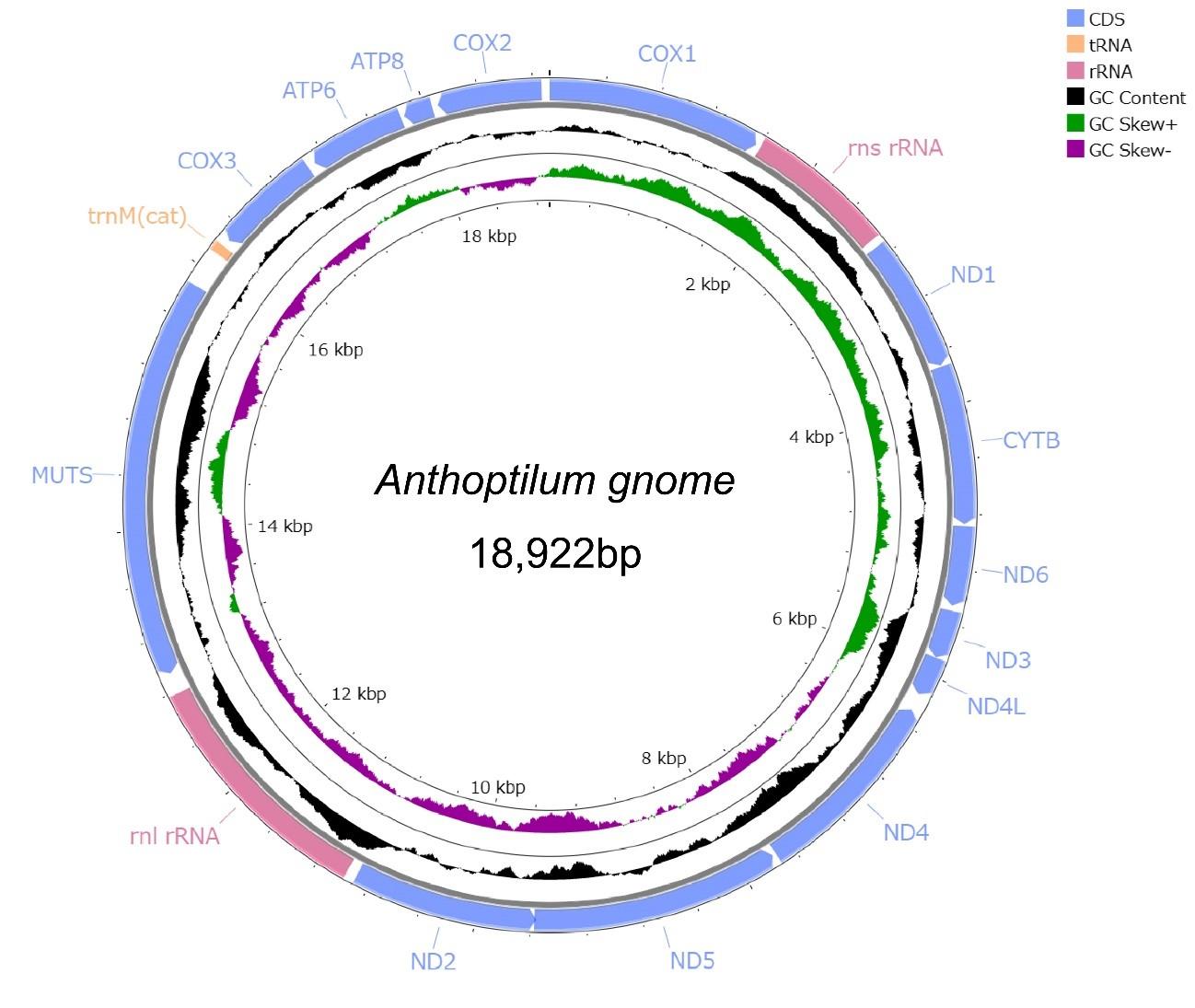 また、ノームツルウミサボテンのミトコンドリアのゲノム情報を18,922塩基対取得し、ミトコンドリアゲノムおよびミトコンドリアのタンパク質コード遺伝子のMutS領域を用いた分子系統樹を作成することによって、吸盤状柄部をもつノームツルウミサボテンの系統学的位置を明らかにしました。その結果、ノームツルウミサボテンは砂泥底に生息する他のツルウミサボテン属の種と近縁であることが明らかになりました。