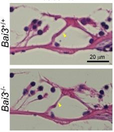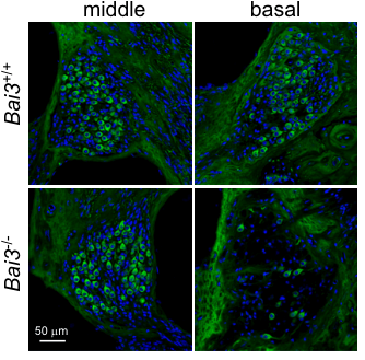 Bai3はマウス蝸牛のpillar cell【※1】で発現しており、Bai3遺伝子を欠くマウスにおいてはpillar cellの形成に異常が認められたことから、Bai3がpillar cellの形成に必須の遺伝子であることが分かりました。