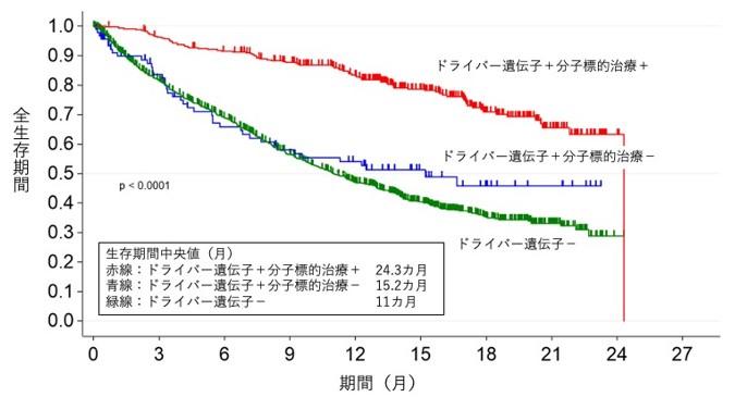 また、ドライバー遺伝子変異の有無と標的治療の有無に分類して、患者の生存期間を比較しました。(1)遺伝子検査の結果ドライバー遺伝子が見つかり、分子標的治療を受けた患者、(2)遺伝子検査の結果ドライバー遺伝子が見つかったが、対応する分子標的治療薬を受けられなかった患者、(3)検査の有無に関わらずドライバー遺伝子が見つからなかった患者、それぞれの生存期間を解析したところ、患者の生存期間中央値は(1)24.3カ月、(2)15.2カ月、(3)11.0カ月でした。これらの結果から、できるだけ多くの遺伝子検査が適切に実施され、その結果に基づく分子標的治療が行われることが、患者のより良い治療成績につながることが示唆されました。