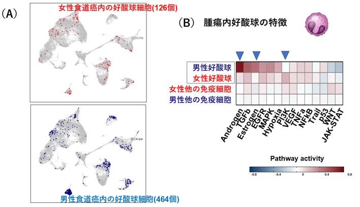 今回、共同研究グループは、まれではあるが最近増加傾向にある女性非喫煙者の食道扁平上皮がんを対象とし、20例のがん組織の全ゲノムRNAシークエンス解析[2]を行い、その変異シグニチャー[3]を一般的な男性喫煙者の食道がんのデータ(74例)と比較しました。その結果、原因変異遺伝子については差異がないものの、加齢と関連する変異シグニチャーが多い傾向にありました。腫瘍内の免疫細胞の活動性を調べると、女性食道がん組織内には、活動性の高い免疫細胞が観察され、特に好酸球[1]が多く検出されました。男女計4例の食道がん組織から免疫細胞を抽出し、その内約31,000個の単細胞(シングルセル)RNA解析[4]を行うと、女性食道がんにおいては好酸球が活性化していました。