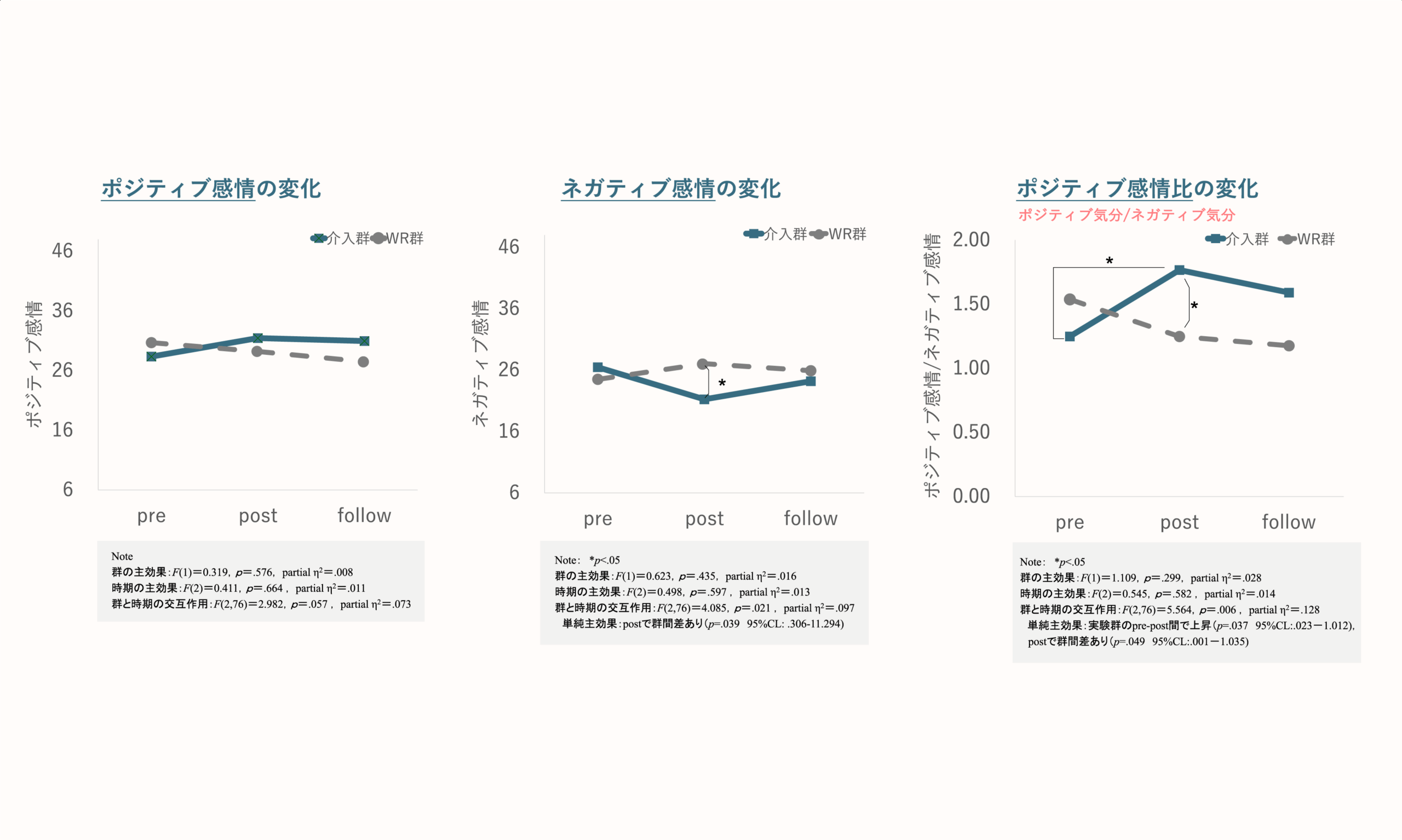 3時点の変化を比較したところ、ポジティブ感情(論文中ではポジティブ気分)および孤独感では有意な主効果および交互作用はみられなかった。ネガティブ感情では群と時期の交互作用がみられ、postにおけるネガティブ感情は「ラムネアプリを利用する群」のほうが低かった。preからpostにかけてポジティブ感情比が高まり、postにおけるポジティブ感情比は「ラムネアプリを利用する群」のほうが高かった。「ラムネアプリを利用する群」の感想では、気分転換になった行動として「音楽(N=10)」や「呼吸や瞑想(N=4)」が多く挙げられた。