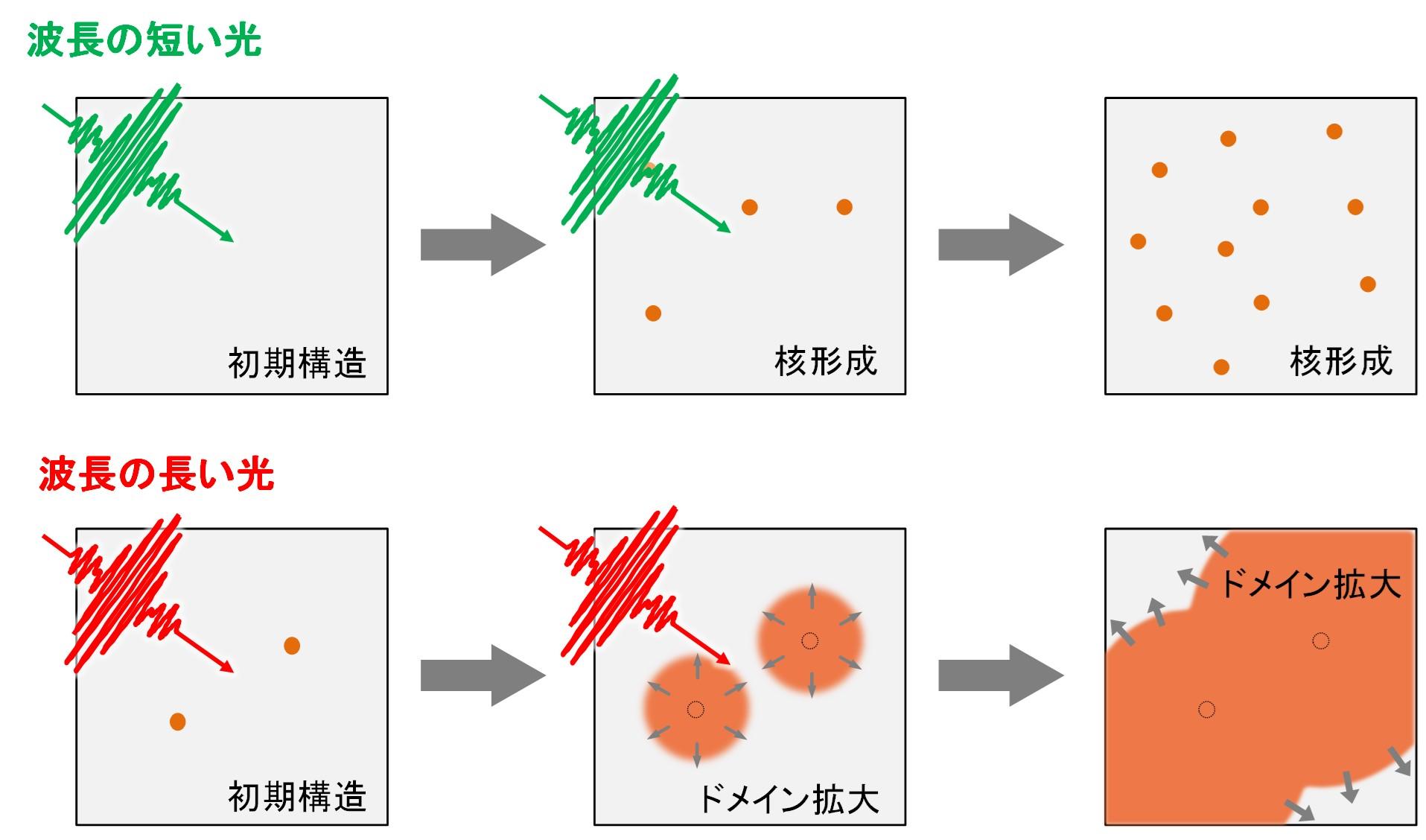 また、上記の相転移プロセスが、当てる光の波長に依存して大きく変化することを発見しました。図2で示すように、短い波長の光を当てると、黒鉛上のいたるところで核が効果的に形成されますが、長い波長の光を当てると、核の形成よりも核がドメインへ拡大するプロセスが優先的に生じます。この結果は、光のチューニングにより、相転移の一連のプロセスを原子レベルで制御できること示しています。
