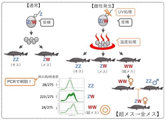 ※1 雌性発生:メス由来の遺伝情報のみから個体を発生させる方法。チョウザメの場合、精子の紫外線(UV)処理と受精卵の温度処理を組み合わせることで行う。