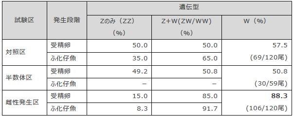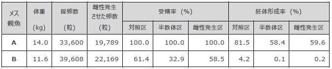 特に、メス親魚Aから多数のふ化仔魚が得られ、メス親魚Aを用いた実験の受精率は全試験区で100%、胚体形成率※5 は対照区で81.5%、半数体区で58.4%、雌性発生区で59.6%でした。その後、対照区と雌性発生区は順調にふ化したものの、半数体区はふ化しなかったことから、雌性発生区と半数体区に用いた紫外線処理精子は遺伝的に不活性化されていることが検証されました(表1)。