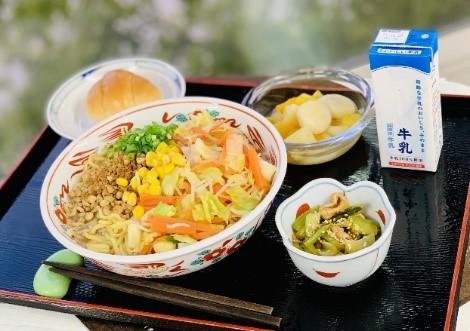 内容 :EARTH FRIENDLYラーメン、小松菜と油揚げのナムル、フルーツポンチ、ロールパン、牛乳
