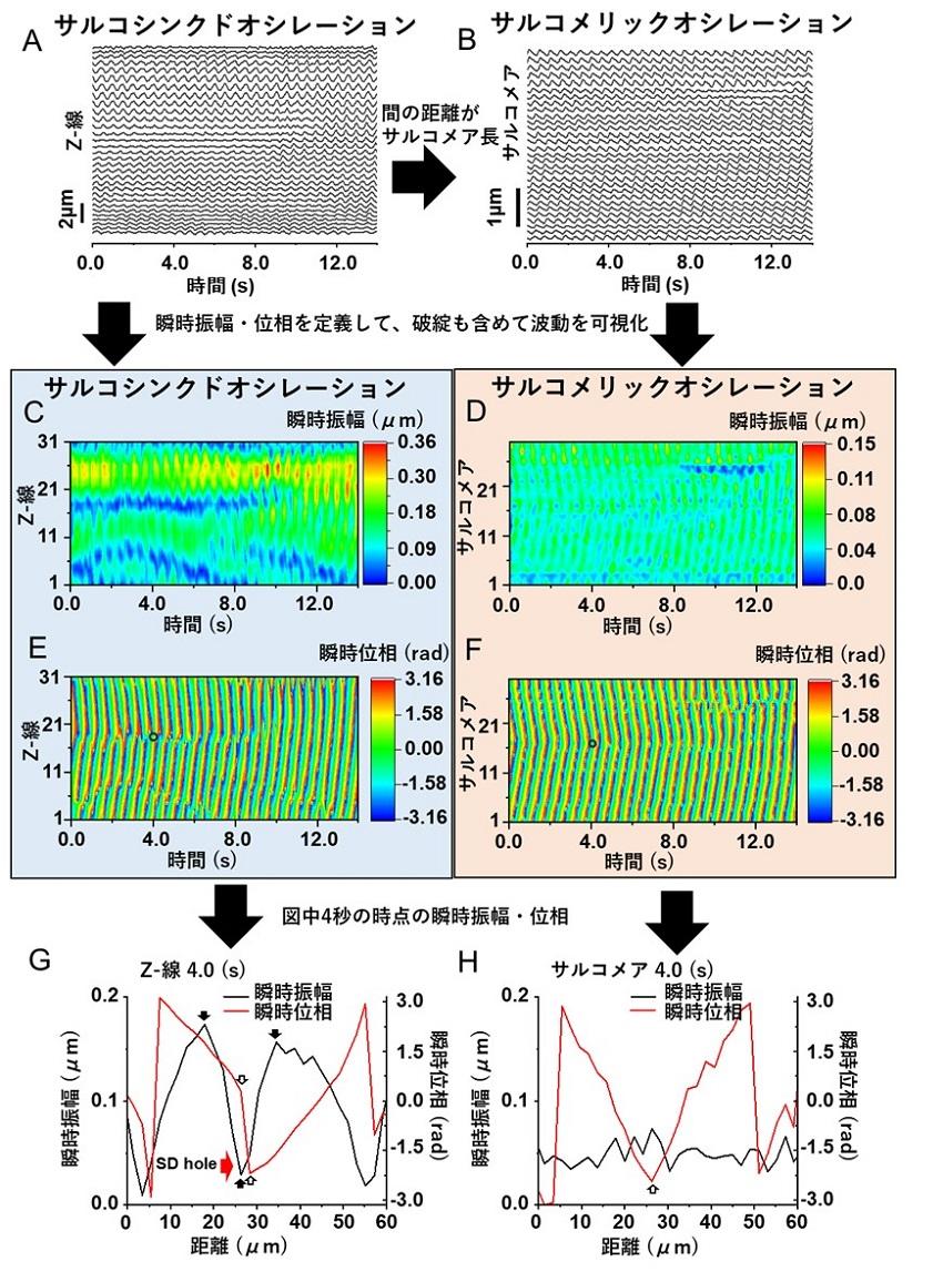 この解析結果において、サルコシンクドオシレーションにおける急激な瞬時位相のジャンプを伴う瞬時振幅の凹み「hole」がサルコメア振動を特徴づける指標として観察されることが判明した(図2)。