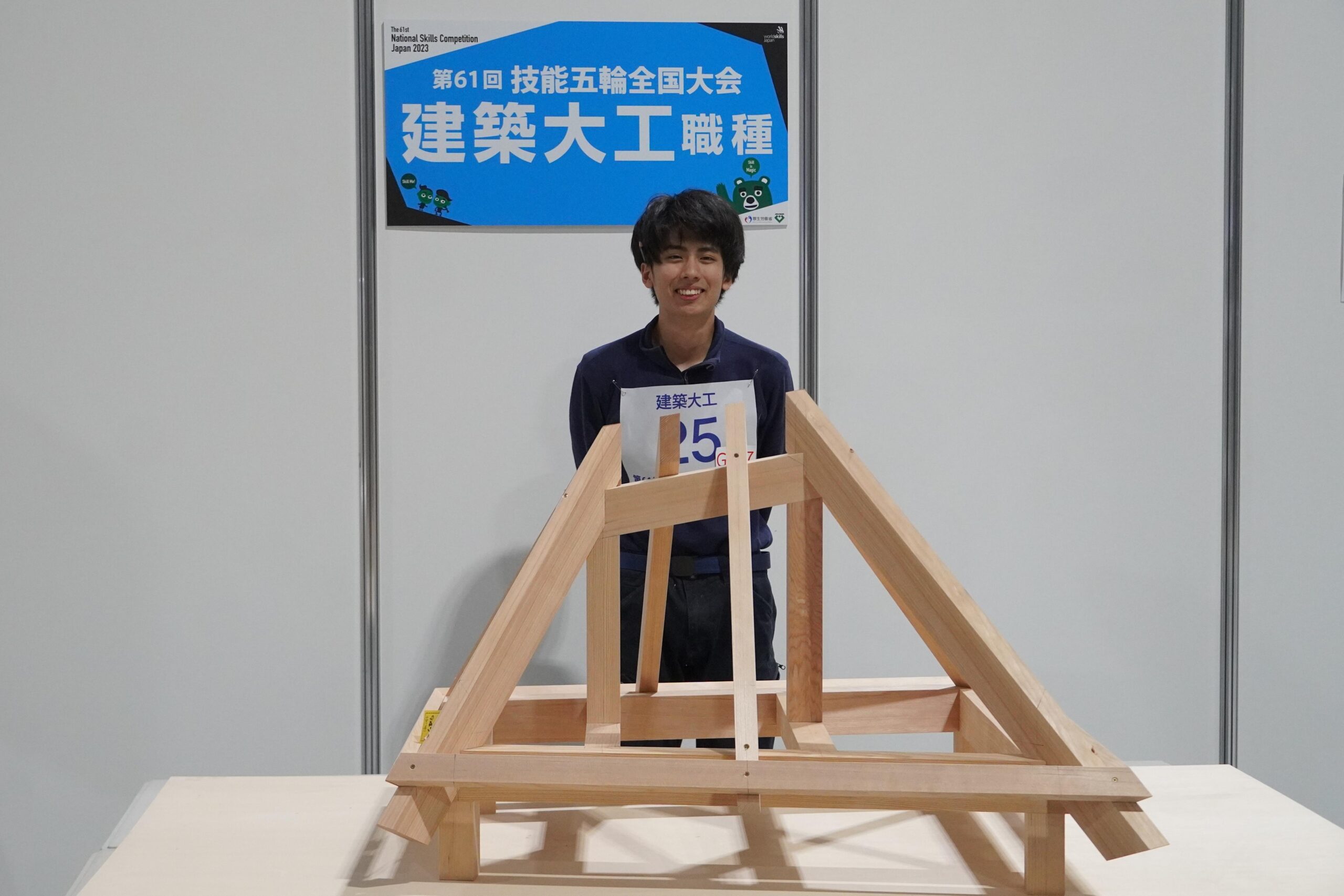 2023年11月17日(金)~11月21日(火)に開催された第61回技能五輪全国大会に、建設学科から4職種6名の学生が出場しました(造園職種1名、建築大工職種2名、家具職種2名、左官職種1名)。うち、造園職種において田子雅也さん(建設学科3年)が第59回大会に次ぐ2度目の金賞を受賞しました。本学の金賞獲得は通算8回目になります。建築大工職種では松村拓夢さん(建設学科3年)が銀賞を受賞。松村さんは、ものつくり大学に入学後、3年連続出場しており、銀賞受賞は2度目です。また、建築大工職種では坂本源さん(建設学科2年)、家具職種では藤井駿一さん(建設学科3年)が敢闘賞を受賞しました。