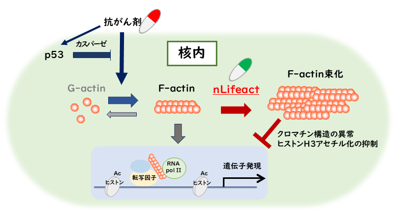 [Fig.3]抗がん剤が誘導する核アクチン線維の形成におけるp53の役割と核アクチン線維結合Lifeactペプチドによる遺伝子発現制御モデル