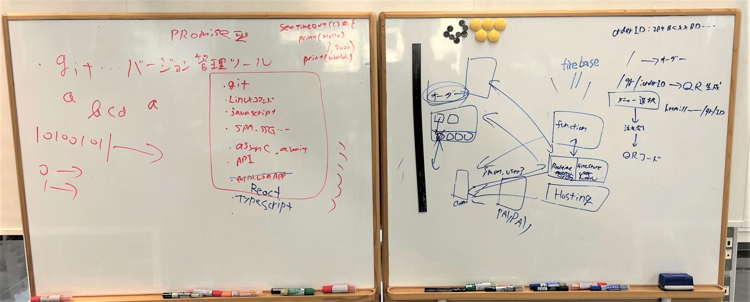 2022年5月から、注文の流れや厨房の作業をホワイトボードに書き出して整理し、使用するプログラミング言語や機能、枠組みを選定しました。約2カ月かけ、Webアプリやクラウドのデータベース、発券機などからなるシステムを構築して連結しました。アプリはブラウザで動作するタイプ(Webアプリ)で、スマホへのインストールなしに使えます。画面に並んだメニューを画像から選択すると決済に進みます。電子マネーやクレジットカードなどから選んで手続きするとQRコードが表示され、専用の小型プリンターから食券を発行します。