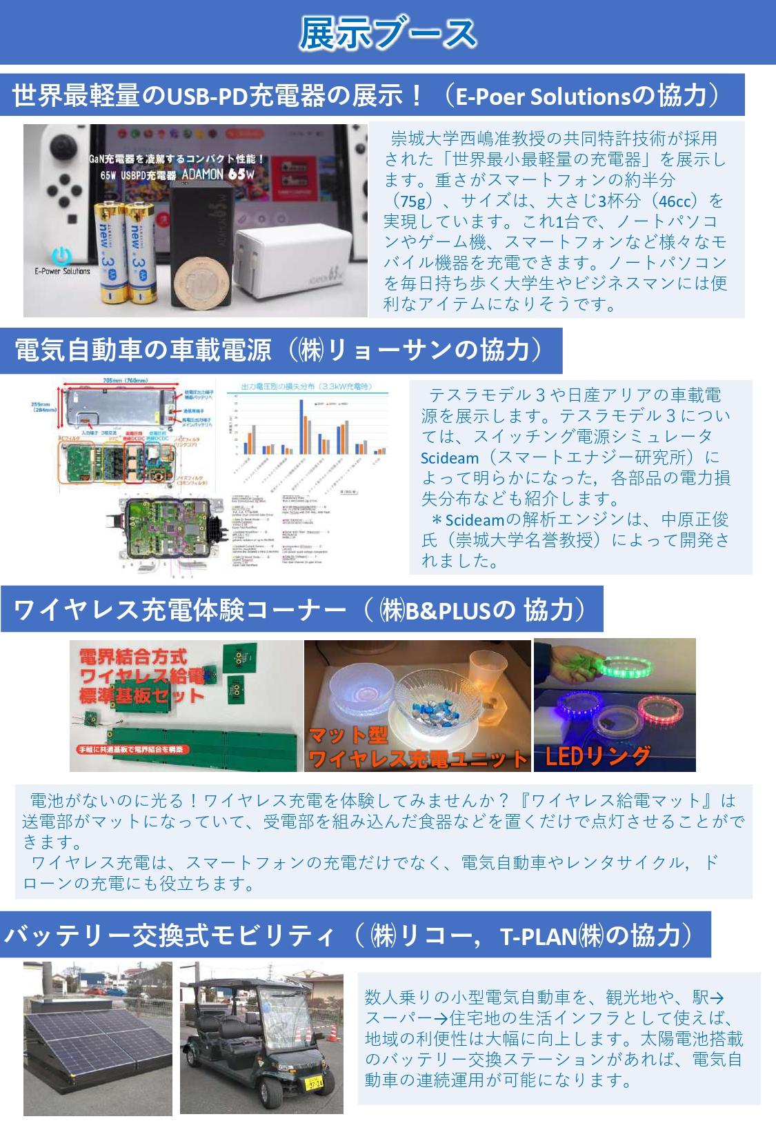 また、展示ブースには、崇城大学 西嶋准教授の共同特許技術が採用された「世界最小最軽量のモバイル機器用充電器」や、バッテリー交換式のグリーンスローモビリティ(リコー、T-PLANとの共同開発)、ワイヤレス充電の体験コーナーなども準備しています。