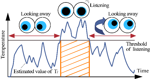 本研究では、会話時の音声入力や振る舞いから、会話の熱量を推定するモデルを開発しました。この推定モデルは、人間が共通的な感覚として理解しやすい温度に着目しています。例えば、「白熱した議論」、「熱心に 聞く」、「熱気に満ちている」といった比喩があるように、人間は共通的な温度感覚によって、他者の感情状態や場の様相を把握しています。本研究では、この比喩として利用される温度情報を、実空間における音声や    うなずきといった振る舞いを入力として変換しています。とくに、発話やうなずきといった熱生産が行われることで、場との温度差が生まれ、場へ熱量が移動します。この流れ込んだ熱量を場の温度とすることで、会話の熱量を推定することができます。