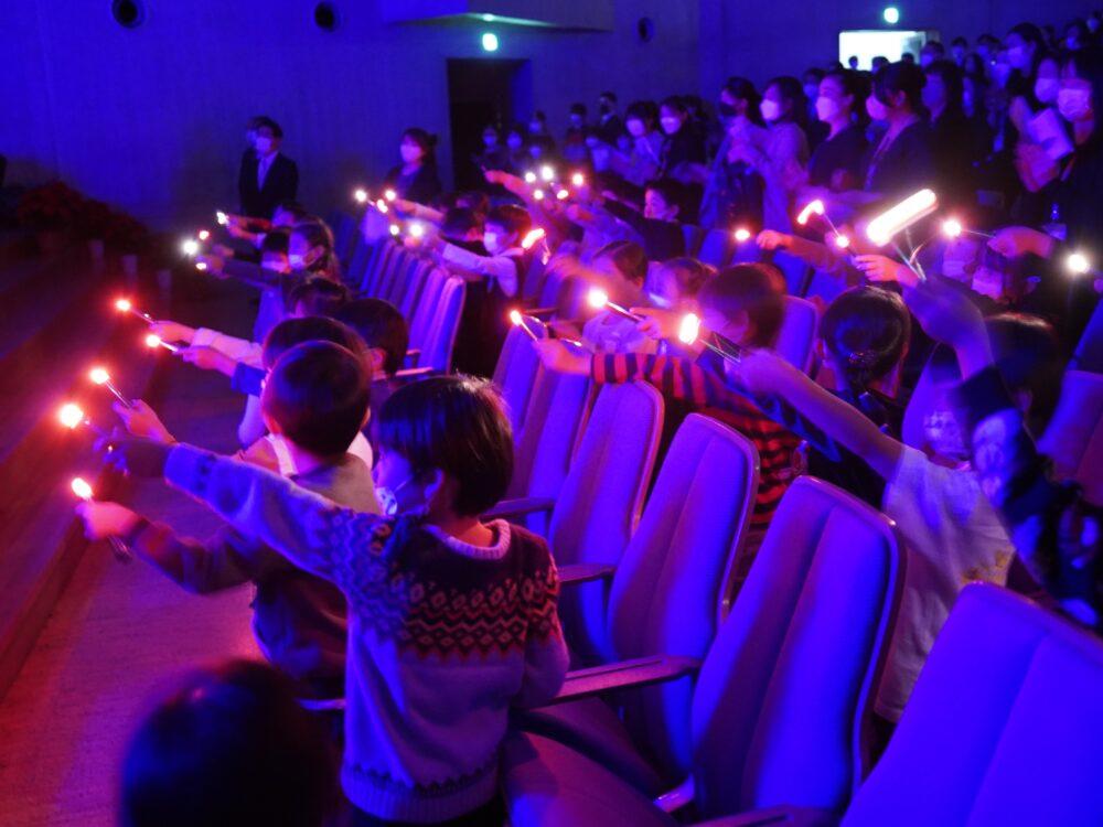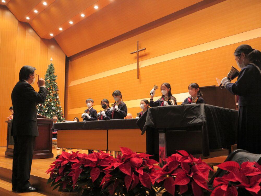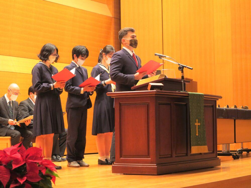 クリスマスツリー点火式は礼拝形式で行われます。聖学院小学校ハンドベル・クラブによる前奏から始まり、聖学院小学校児童聖歌隊による賛美、聖学院中高および女子聖学院中高宗教委員による聖書朗読が行われます。クリスマスメッセージは女子聖学院中学校・高等学校チャプレンが語ります。聖学院幼稚園年長組の聖書の言葉を合図にツリーに光が灯され、聖学院中高吹奏楽部・音楽部による賛美奉献と祝祷を通して、クリスマスの到来を待ち望みます。
