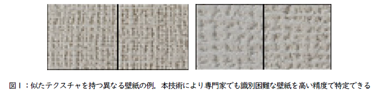 同志社大学理工学部・奥田教授の研究チームは独自の機械学習アルゴリズムを用いた、微細なテクスチャの差異に基づく画像識別システムについて研究しています。今回コマツ株式会社と共同で、本技術を応用した壁紙識別アプリをリリースすることとなりました。建築業界では、長い間、施工後の材料のメーカーや品番を特定する作業には、多くの物理的なカタログを用いて、施工材料と比較するという手段が取られてきました。このような方法では、一つの不明な材料の品番を特定するのに2、3時間かかることも少なくありません。さらに、微細なテクスチャの違いによって壁紙を識別するのは、熟練した専門家でさえも困難であり、それが大きな課題とされています(図1を参照)。今回の研究で開発されたシステムは、これらの問題をスマートフォン1台、わずか数秒で解消する高精度で高速な識別システムです。