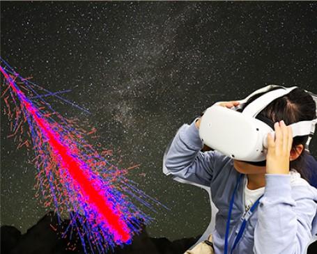 遠い宇宙から到来する宇宙線が大気中で引き起こすダイナミックな現象をCGで再現。