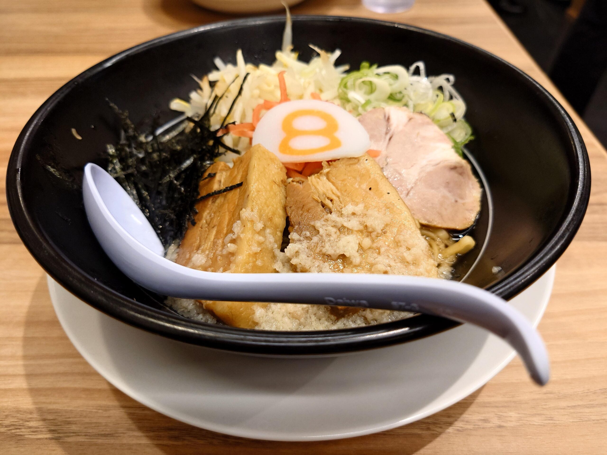 プロジェクトコラボ商品の第一弾として、11月10日の8番らーめん金沢工大前店のオープンにあわせて同店限定・数量限定で発売が始まった背脂角煮唐麺。「ボリューム」「食べ応え」「トッピング」というキーワードで開発された。