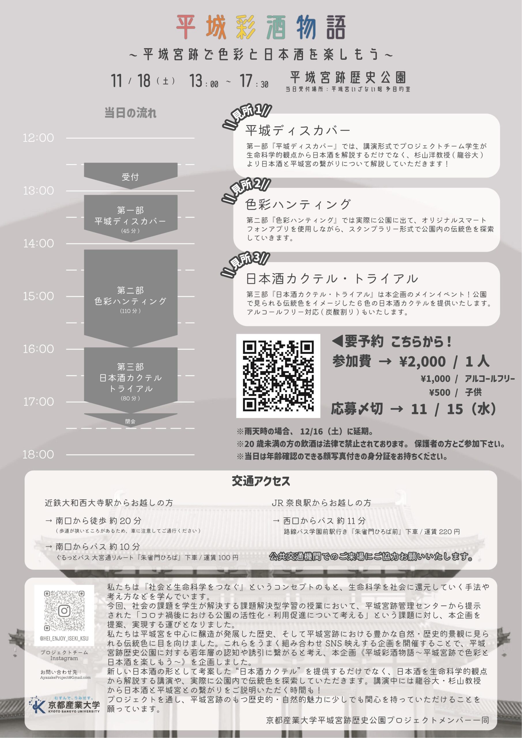 この魅力を伝えるために11月18日(土)(雨天の場合12月16日(土)に延期)に平城宮跡歴史公園にて開催するイベント「平城彩酒物語」では、平城宮跡で奈良時代の造酒司(酒を造る役所)が発掘され、一部復元されているという歴史的背景について考古学者 による講演や、日本酒製造において要となる麹菌を生命科学の視点から解説する。また、色彩豊かな日本酒カクテルの試飲に加えスマートフォンアプリを活用しながら公園内を散策し、ビンゴゲーム感覚で伝統色を探すなど五感を使い平城宮跡歴史公園を楽しむ機会を提供する。