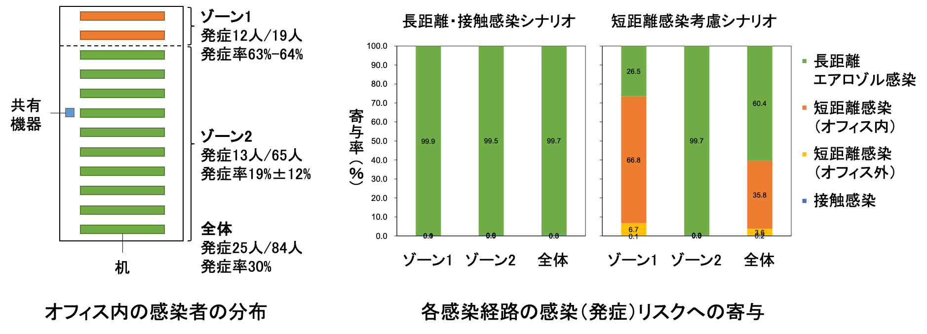 オフィスでの新型コロナウイルスの感染経路別リスクを明らかに クラスター発生時の長距離エアロゾル感染のリスクと対策効果を評価
