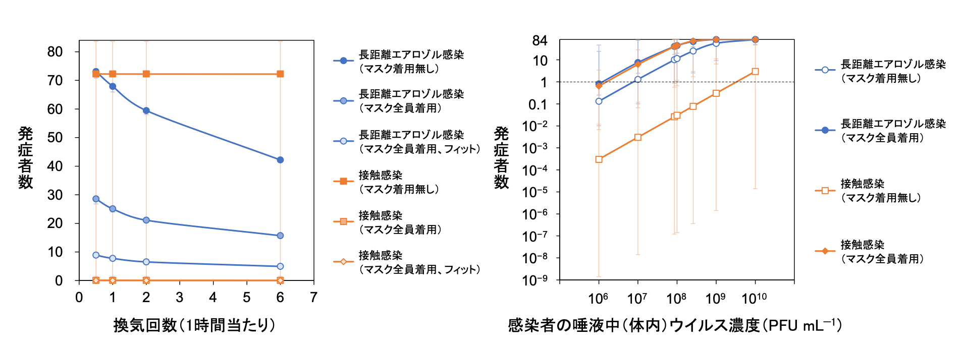 研究グループは、実際のオフィスにおけるクラスター発生事例に基づき感染経路別のリスクを予測するシミュレーションモデルを構築し、長距離エアロゾル感染と接触感染のリスクを算出しました。広いオフィスで全員マスクを着用していてもクラスターが発生したケースについて解析したところ、会話をする距離より長く(1~2m以上)エアロゾルが移動して感染する、長距離エアロゾル感染が主な感染経路である可能性が高いことが示唆されました。また、このケースでは、オフィス全員のマスク着用や、換気量の増加によって感染リスクの低減に大きな効果があることも明らかになりました。しかし同時に、これらの対策のみでは長距離エアロゾル感染を防ぎきれないこともわかっています。