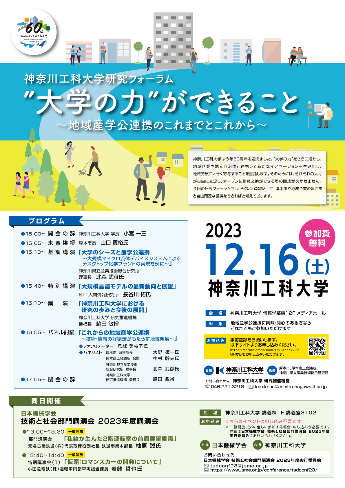 これからも、“大学の力”をさらに活かし、地域企業や地元自治体と連携して新たなイノベーションを生み出し、地域発展に大きく寄与することを目指します。そのためには、それぞれの人材が自由に交流し、オープンに情報交換ができる場が欠かせません。厚木市や地域企業の皆さまと自由闊達な議論をする場として、研究フォーラム「“大学の力”ができること~地域産学公連携のこれまでとこれから~」を2023年12月16日に開催します。