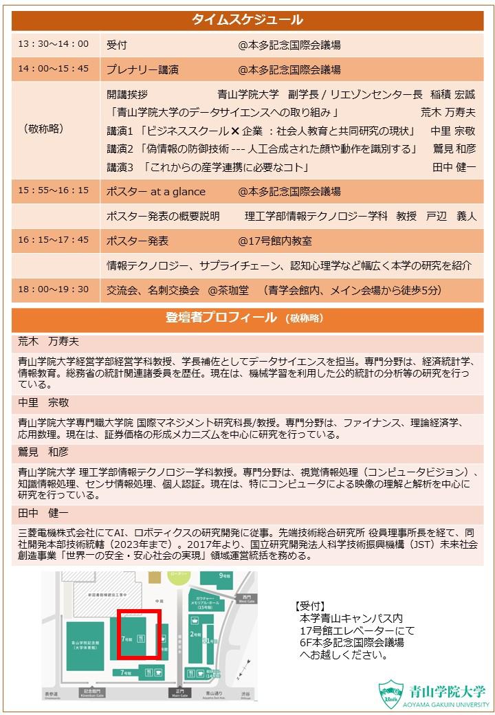 全学を挙げて推進している「青山学院大学のデータサイエンスへの取り組み」に関する講演やポスター発表を通して、分野横断的な研究について幅広く紹介する。同大の多様な研究に触れ、企業が探究するシーズや研究者との出会いの場として本イベントを開催する。