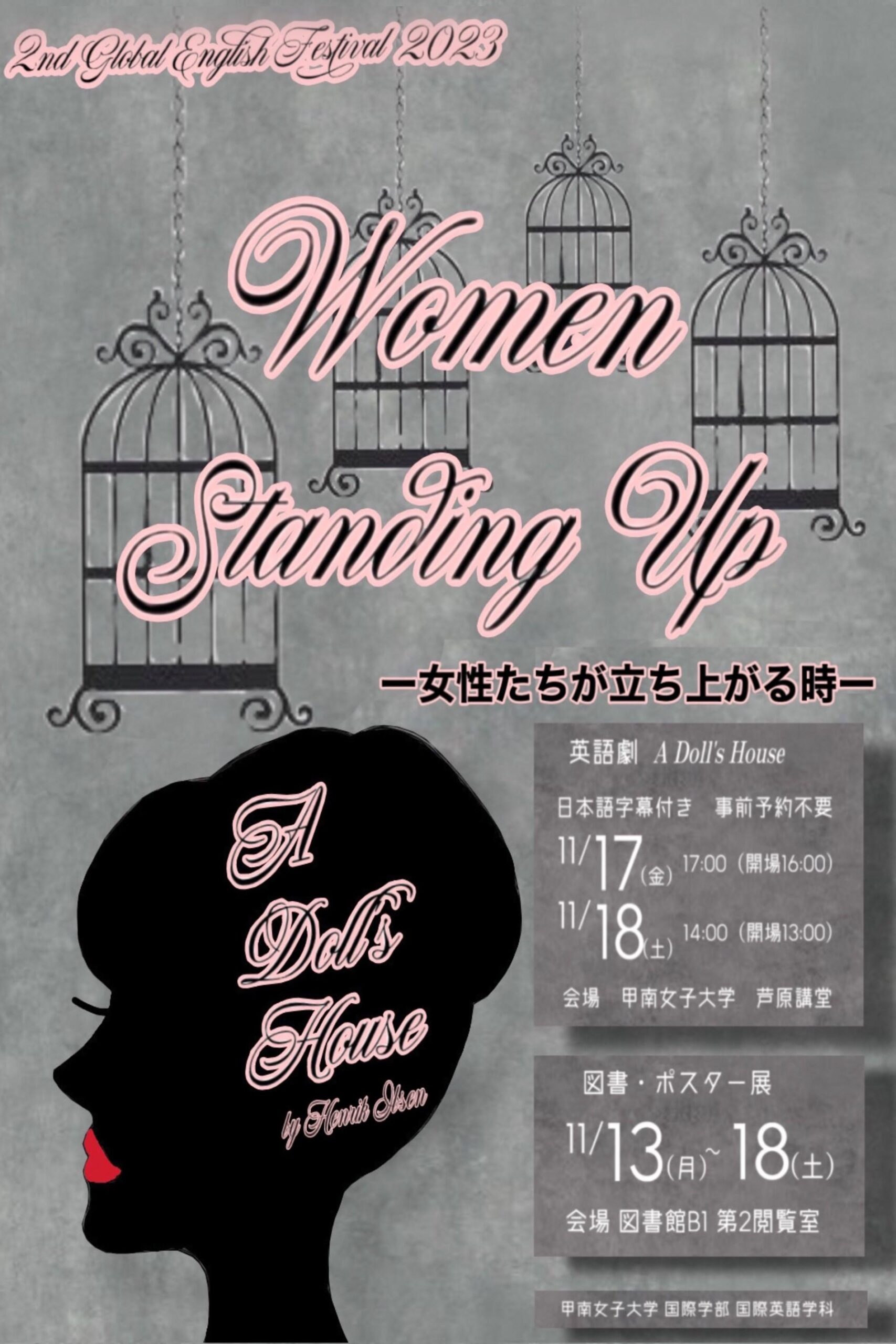 今年度は「Women Standing Up-女性たちが立ち上がる時-」をテーマに、英語劇『人形の家』の上演に加え、サテライトイベントとして図書・ポスター展と特別講演を実施します。 『人形の家』は、19世紀に書かれたヘンリック・イプセン作の戯曲です。3人の子を持つ母親・ノーラが、女性の地位や権利が認められていなかった時代に直面した葛藤や決意が見所です。劇は全編英語で上演しますが、日本語字幕付きで幅広い方々にお楽しみいただけます。
