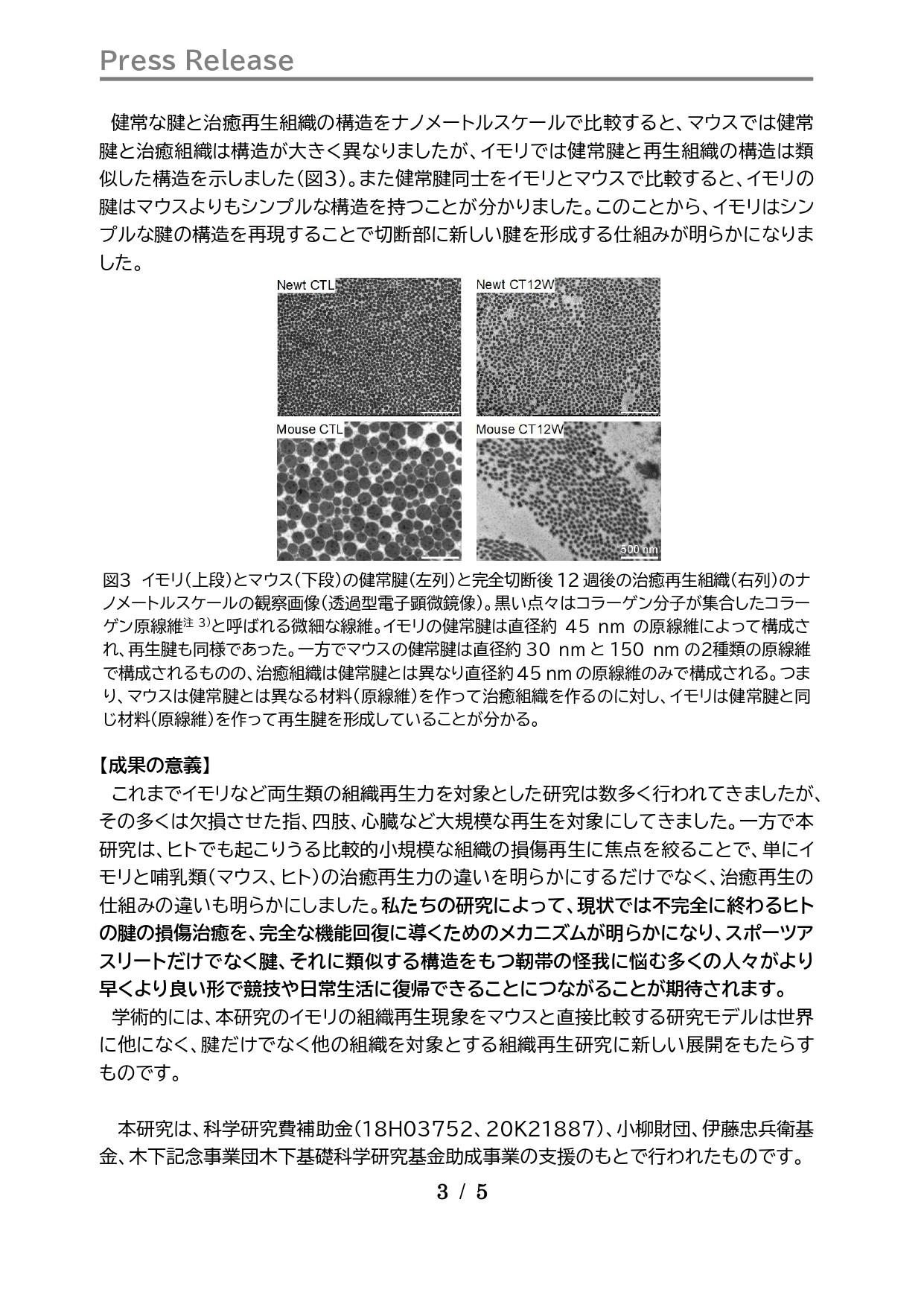 私たちが腱を損傷した場合、現在は治療として損傷した部位を保存する、あるいは縫合や血小板投与、自家腱の移植などの外科的な処置が施されます。しかし、いずれの方法でもアスリートであれば競技復帰までには数ヶ月を要し、また一度断裂した腱を完全に元通りにする治療法は確立していません。イモリは切断された腱をわずか3ヶ月(12週間)でその強度、剛性を健常な腱と同じレベルまで回復させることができ、それはマウスと比べてイモリの腱がシンプルな構造であることが鍵であることが分かりました。今後の研究から、プロアスリートのみならず一般人の腱の断裂や損傷を早期に回復させ、競技や日常生活に復帰させる医療技術開発への応用が期待されます。