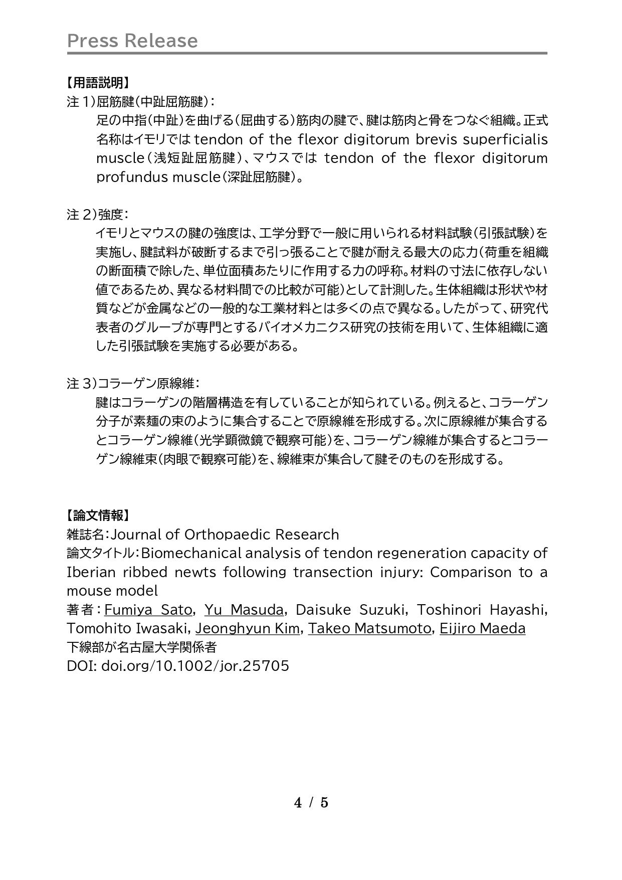 国立大学法人東海国立大学機構 名古屋大学大学院工学研究科の佐藤 史哉 博士前期課程学生(研究当時)、前田 英次郎 准教授、松本 健郎 教授らの研究グループは、広島大学両生類研究センターの林 利憲 教授、北海道千歳リハビリテーション大学の鈴木 大輔 教授、酪農学園大学の岩崎 智仁 教授との共同研究で、イモリを用いて損傷した腱が完全に再生する現象と、そのメカニズムを人間に活かすためのヒントを新たに発見しました。