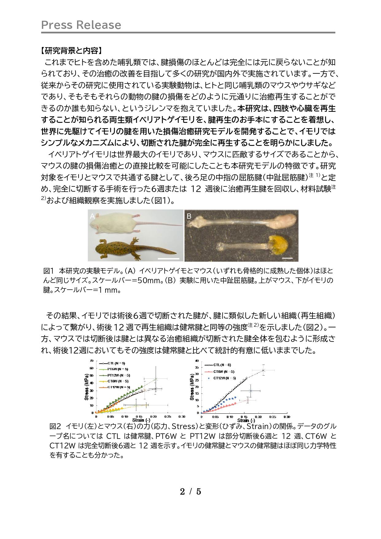 ・イモリは、四肢や心臓をも再生させる強い再生能力を持つことで注目されてきた。今回は、私たちの日常で起きる腱の怪我をイモリで再現し、治癒の過程をマウスと較べることで、その再生能力を調べる、という研究を世界で初めて実施した。