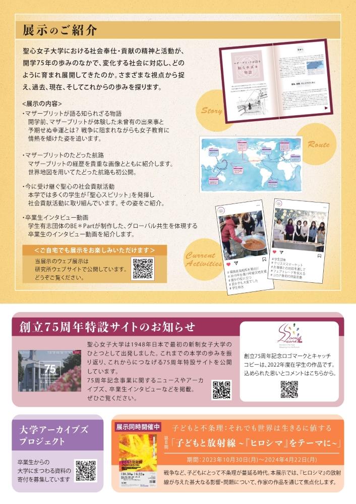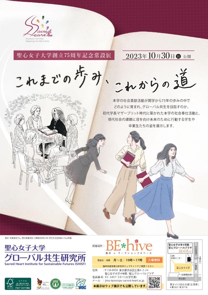 また、4号館(聖心グローバルプラザ)では、創立75周年を記念する展示を公開。展示の内容はWEBからも観覧可となっている。