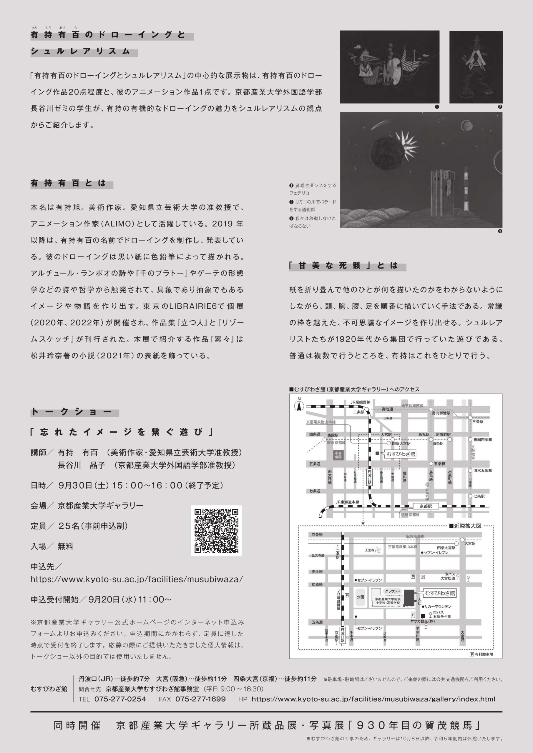 【京都産業大学】ギャラリー展示「有持有百のドローイングとシュルレアリスム」 — 同時開催 — 写真展「930年目の賀茂競馬」・所蔵品展「くらしの中の祈り」を開催