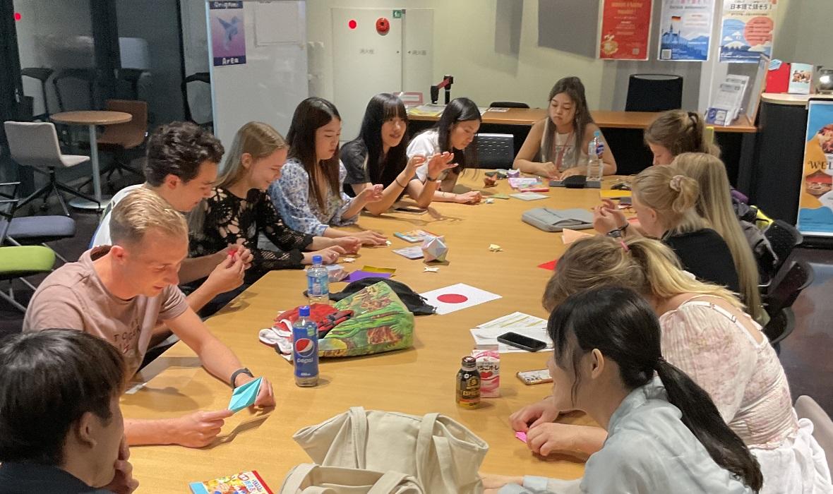 イベントは、2部構成で行われ、第1部では、使用する言語別に3つのグループに分かれ、「LINK」のスタッフ進行のもと、自己紹介、自国の文化や名所の紹介、日本の好きなところ、京都でやってみたいことなどの話題で打ち解けあい、第2部では、コモンズ内に「けん玉」、「クロスワードパズル」、「ボードゲーム」、「多言語しりとり」など7つのイベントコーナーを設置し、さらに交流を深めた。「折り紙コーナー」では、自分で折ったカエルを飛ばし合いながら和気あいあいとした時間を過ごし、お箸を使った「豆つかみゲーム」は、留学生が奮闘し、始終笑顔と笑い声が溢れた。イベント終了後も、多くの参加者が会場に残って、語り合う姿が見られた。