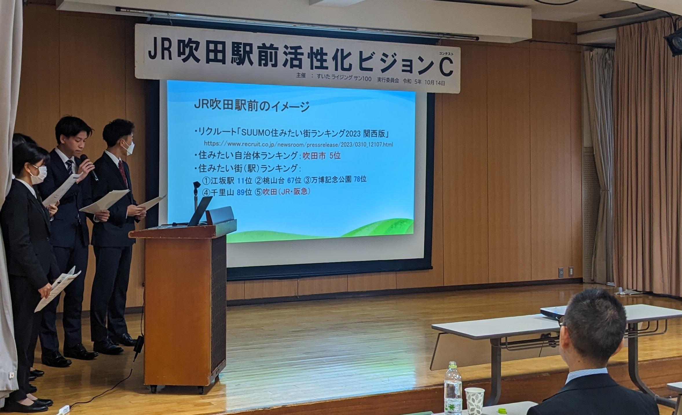 大阪成蹊大学(大阪市東淀川区 / 学長 中村佳正)経営学部 経営学科 公共政策コース 荒木 俊之准教授のゼミ生が2023年10月14日(土)に実施された「すいたライジングサン100イベント」の企画「ビジョンコンテスト~JR吹田駅前の活性化ビジョン~」に参加しました。同コンテストにて、これからも100年続く未来を見据えて、私たちが「住んでみたい」という視点で、まちづくりの目標と実現方法を考え提案。本学のグループが最優秀賞(済生会吹田病院賞)を受賞しました。